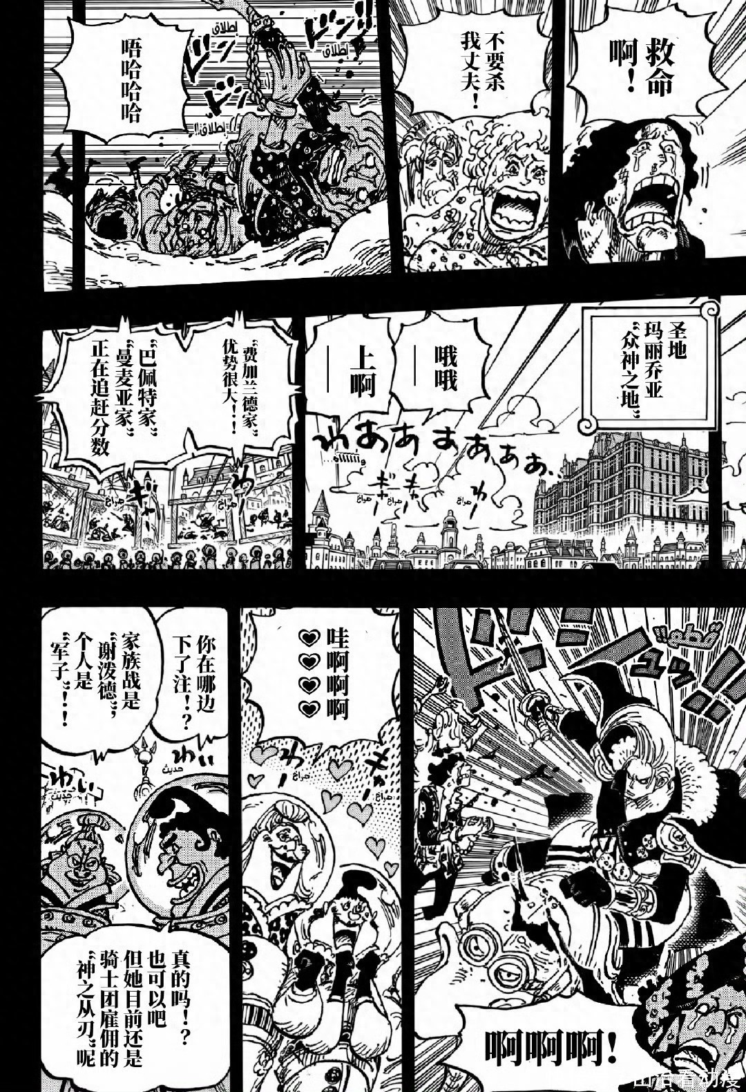 神之骑士团绑架了巨人族的孩子,他们来到学校附近,看到孩子在上课,于是出手绑架了孩子,直接把孩子押送到港口,之后就是押送到圣地玛丽乔亚。巨人族战士得知孩子出事了,他们和草帽一伙停止宴会,直接去对抗梦魇怪物,草帽一伙去营救孩子。